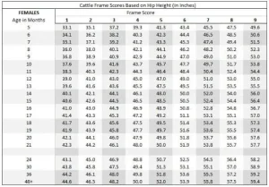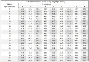 At 20 months of age, the hip height of that cow will only hover around 49.8 inches. And the same goes for other frame score levels. You can check with your cows for a sure comparison.