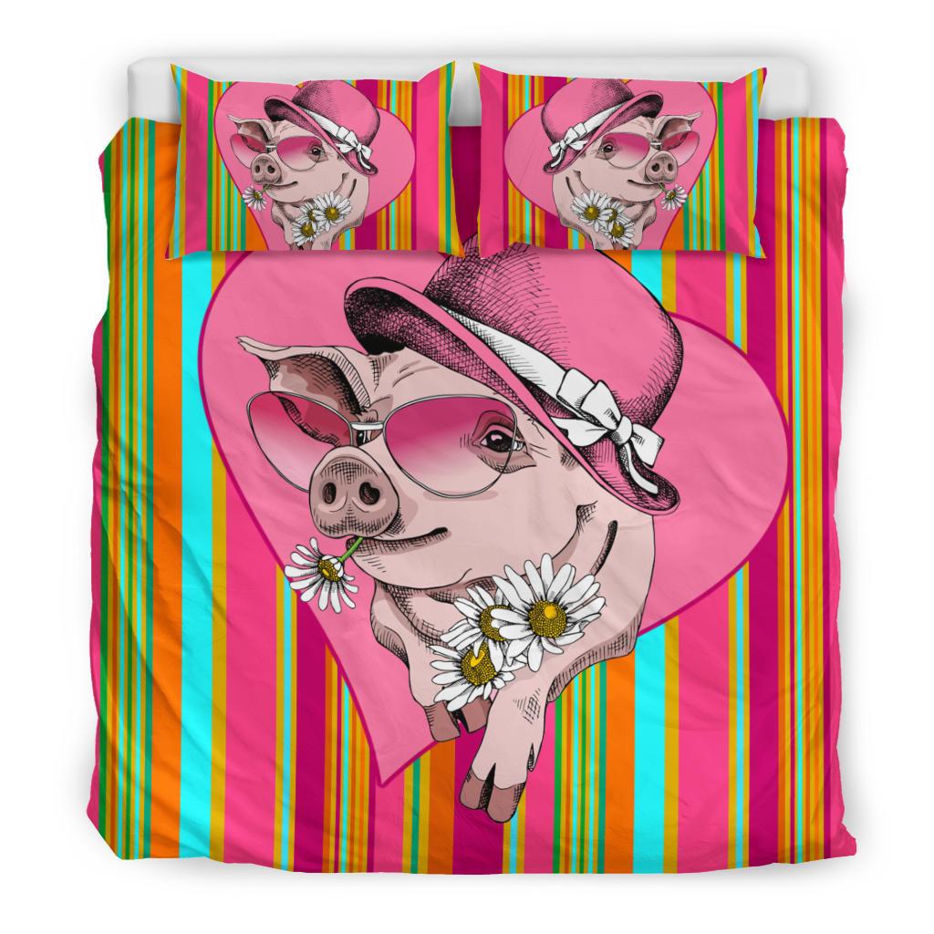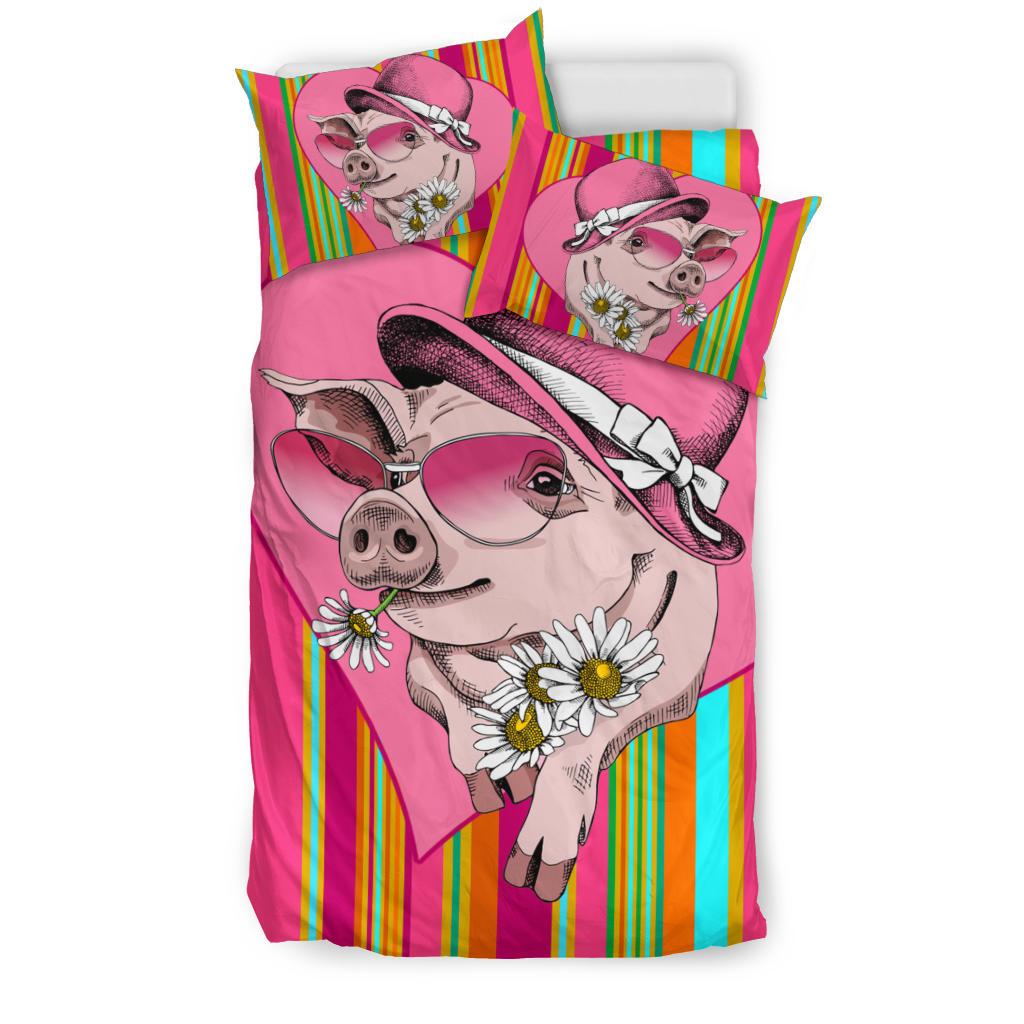Very Cute Cartoon Pig Lady Wear Hat and Sunflower Bedding Set